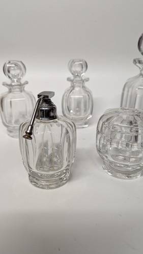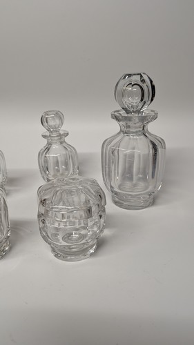 NÉCESSAIRE DE TOILETTE en cristal, modèle Harcourt, comprenant un grand flacon (22 cm), une paire de flacons (15,5 cm), un poudrier couvert et un vaporisateur.