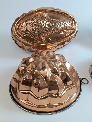 QUATRE MOULES en cuivre étamé dont deux à kouglof, un à terrine de poisson et un à tarte aux poissons.