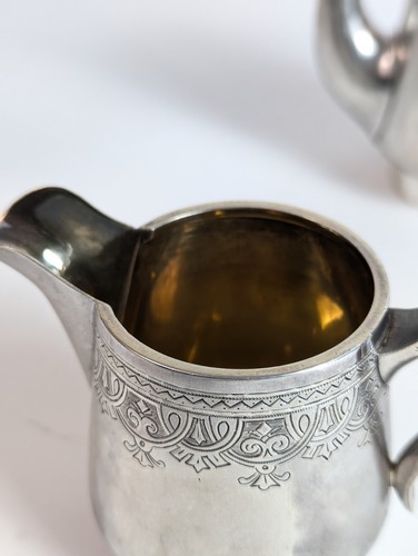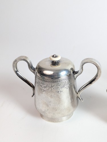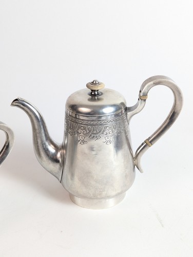 SERVICE A THÉ en argent (84 zolotniks-875) à décor gravé de frise de rinceaux comprenant une théière égoïste, un sucrier couvert et une verseuse.