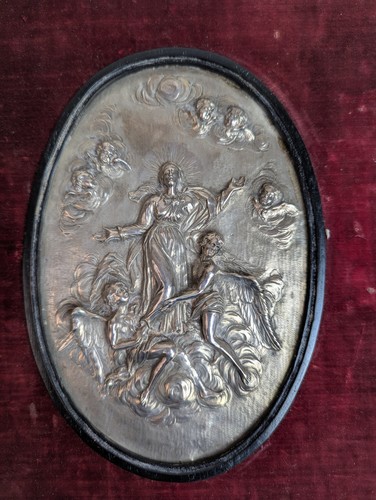 MÉDAILLON ovale en argent repoussé et ciselé représentant l'Assomption de la Vierge d'après un Maître. Cadre gainé de velours rouge.