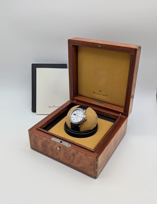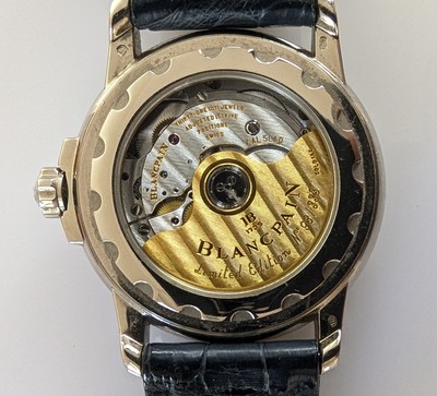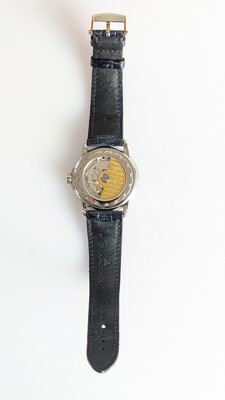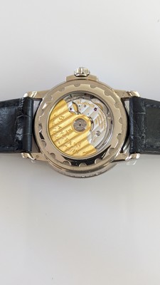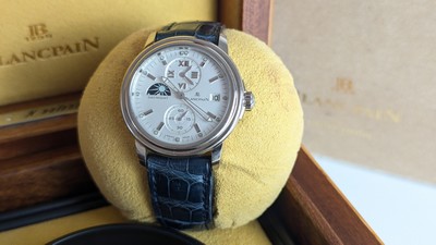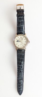 MONTRE bracelet d'homme, modèle Leman Time Zone, en or gris (750), mouvement automatique, boîtier rond à deux gradins, cadran blanc, guichet Dual Time à 12h, dateur à 3h, guichet des secondes à 6h et passages de lune à 9h. Fond de boîtier en verre saphir.