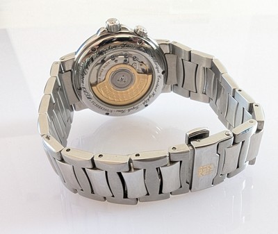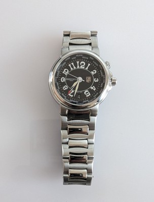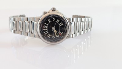 MONTRE bracelet modèle Highlife Triple Time, en acier, mouvement automatique, boîtier rond, cadran à fond noir avec guichet dateur à 6h, date perpetuelle avec aiguille à flèche rouge, fond de boîtier en verre saphir.