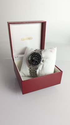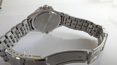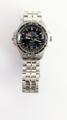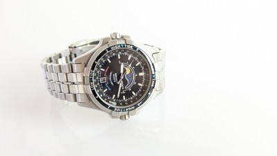 MONTRE bracelet d'homme Sport 150 Monthly Tide, en acier, mouvement à quartz, boîtier rond à lunette noire fixe, cadran à fond noir avec passage de lune et guichet dateur à 6h, deux remontoirs. Bracelet acier à boucle déployante.