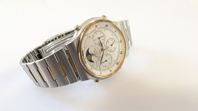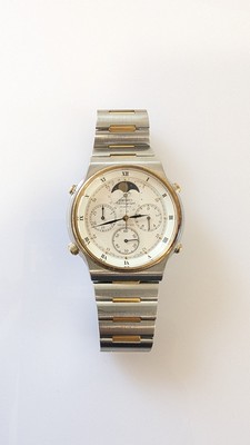 MONTRE bracelet, mouvement quartz, en acier et doré, boîtier rond, cadran à fond blanc avec passage de lune dans le cadran de la date à 12h, et trois cadrans à 3h, 6h et 9h.