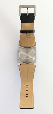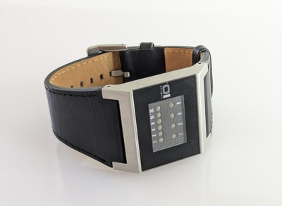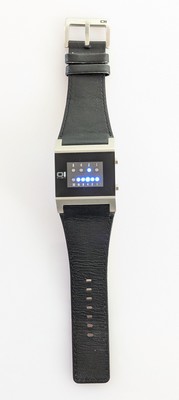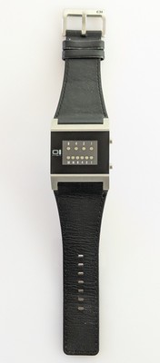 MONTRE bracelet modèle Kerala Trance, mouvement quartz, boîtier rectangulaire en acier, cadran à affichage binaire. Large bracelet en cuir noir à boucle ardillon.