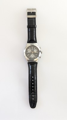 MONTRE bracelet à mouvement quartz, boîtier rond en acier, cadran gris brillant à trois compteurs et guichet dateur à 4h. Bracelet en cuir noir façon crocodile à boucle ardillon de la marque.