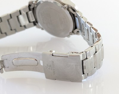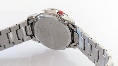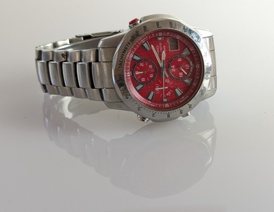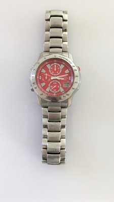 MONTRE bracelet Alarm, Chronograph, Dual time en acier, mouvement quartz, boîtier rond à lunette graduée fixe, cadran à fond rouge à trois compteurs et guichet dateur analogique à 4h.