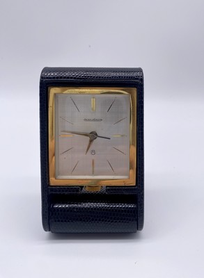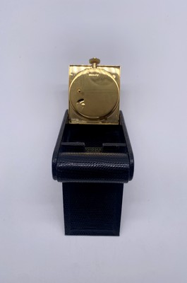 PENDULETTE de voyage rectangulaire en métal doré, mouvement mécanique, dans un étui à façade basculante formant trépied gainé de cuir noir lézard.