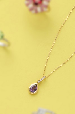 COLLIER en or (375) orné d'un pendentif avec une améthyste de forme poire et petits diamants.