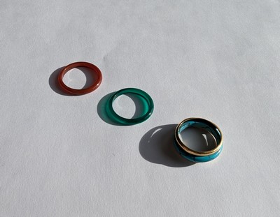 BAGUE en or (750) à double jonc et anneau central interchangeable en turquoise, vert ou rouge.