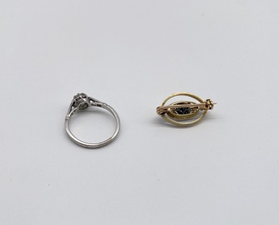 JOINT : PETIT BROCHE oblongue en or jaune et gris (750) avec petits éclats de diamants et onyx, style 1920.