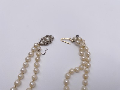 COLLIER DE PERLES de culture double rang chocker. Fermoir stylisé en or (750) serti de saphirs incolores et d'une perle. Avec chaîne de sécurité.
