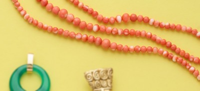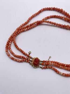 COLLIER DE CORAIL à trois rangs de billes orange (parties blanches), en chute.