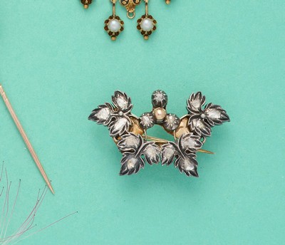 BROCHE en or (750) et argent (950) à motifs de feuillage sertissant des diamants en rose.