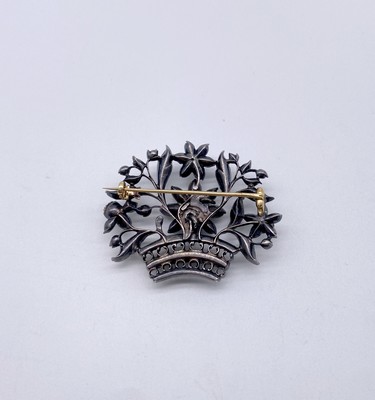 BROCHE "panier fleuri" en argent (800) sertie d'émeraudes synthétiques et de diamants à la serpe.