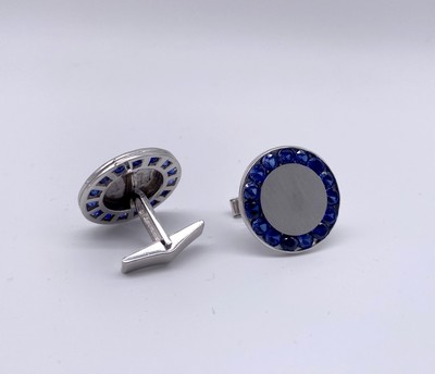 PAIRE DE BOUTONS DE MANCHETTE en or gris (probablement 585) de forme ronde à bordure de 15 saphirs taille brillant montés sur rail.