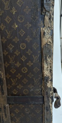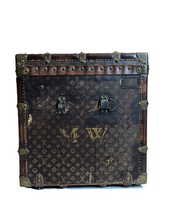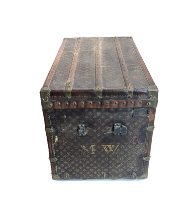 MALLE DE VOYAGE en bois gainé de toile monogram et chiffrée MW sur les côtés. Renforts d'angles en fer. Serrure numérotée 062699 et marquée "1 rue Scribe, Paris, Louise Vuitton, London, 149 New Bond Street"