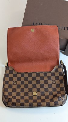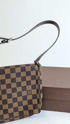 SAC A MAIN en toile damier ébène, fermoir aimanté, bandoulière réglable en coton marron.