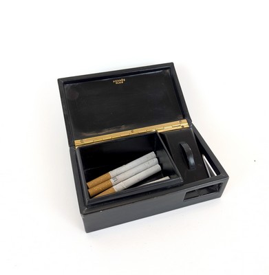 BOÎTE A CIGARETTES en bois gainé de cuir box noir ouvrant à un abattant et un compartiment à allumettes en ceinture. Marque gauffrée à l'intérieur.