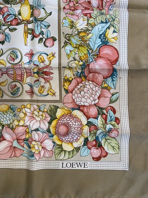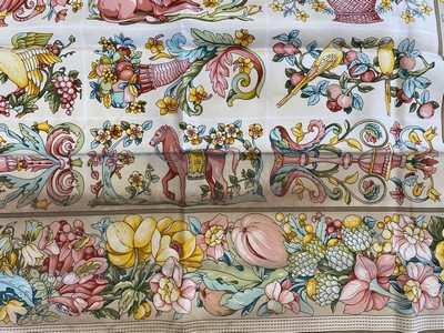 FOULARD en soie à décor de fleurs, fruits, oiseaux et chevaux sur fond crème, bordure marron.
