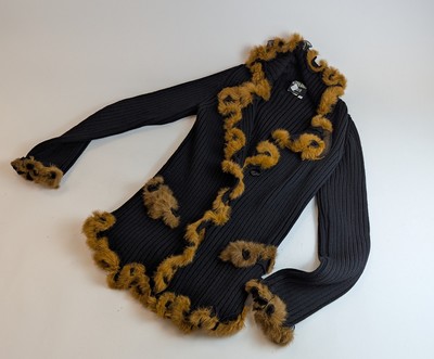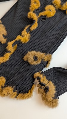 GILET en laine noire à bordure de tulle noir et fourrure de lapin à deux poches, fermant à quatre boutons.