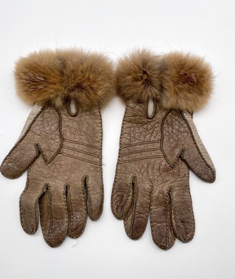 PAIRE DE GANTS en cuir grainé doublé de fourrure naturelle. Intérieur en soie.
