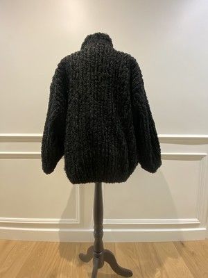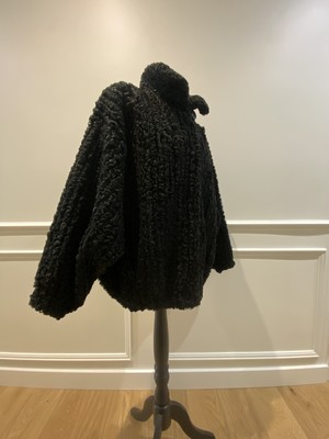 BLOUSON de forme boulle en astrakan à deux poches, fermeture à crochets invisibles, doublure noire.