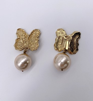 PAIRE DE BOUCLES D'OREILLES en métal doré et fantaisie, stylisant un papillon retenant une perle (22 mm).