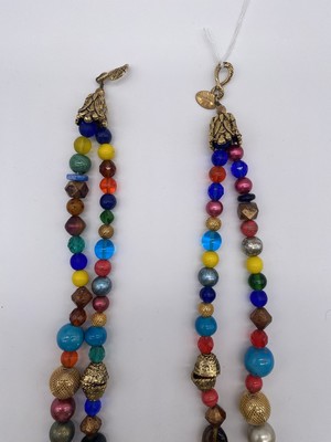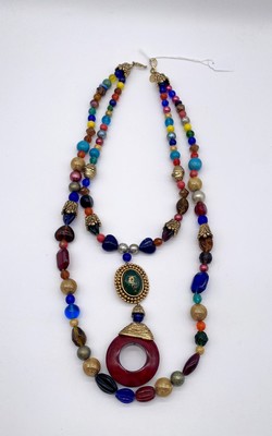 GRAND SAUTOIR deux rangs, en perles de couleurs de toutes matières, avec grand pendentif central à cabochon vert et anneau rouge. Attaches et fermoir en métal doré. Signé sur pastille.