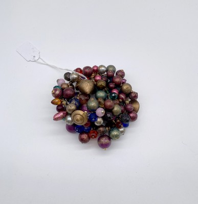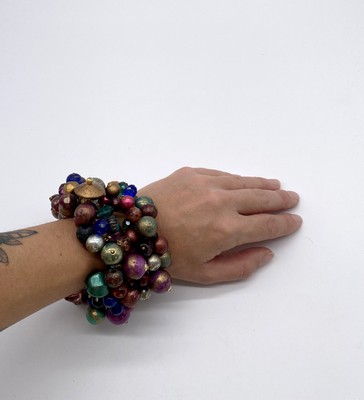 LARGE BRACELET à deux rangs à importantes breloques de perles de couleur de toutes matières et métal doré. Signé sur pastille.