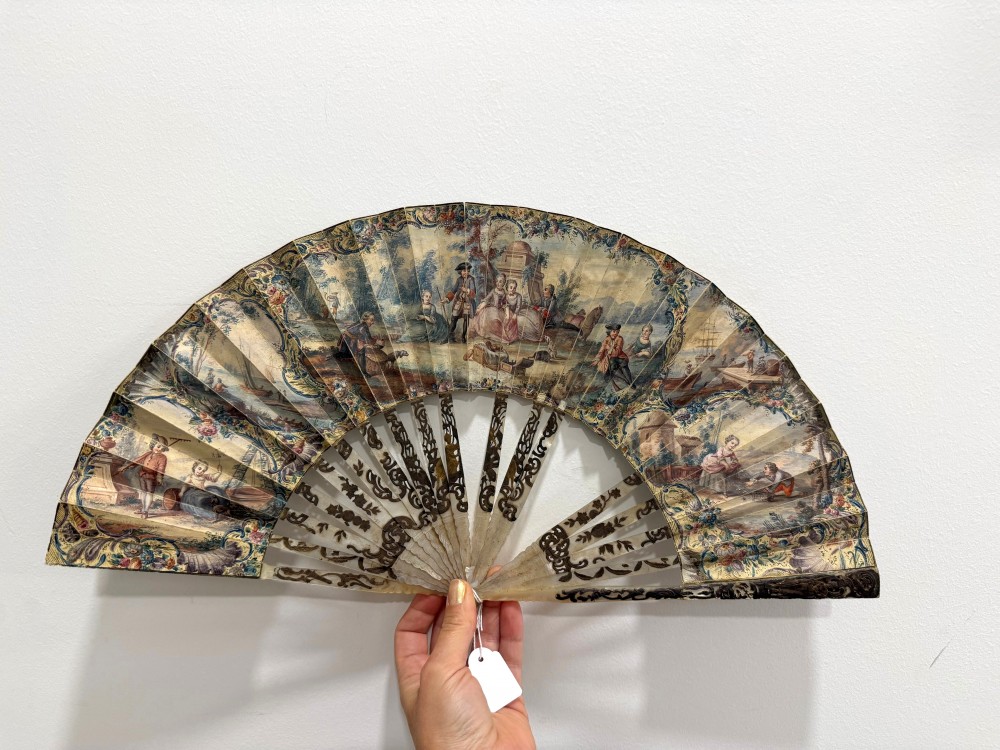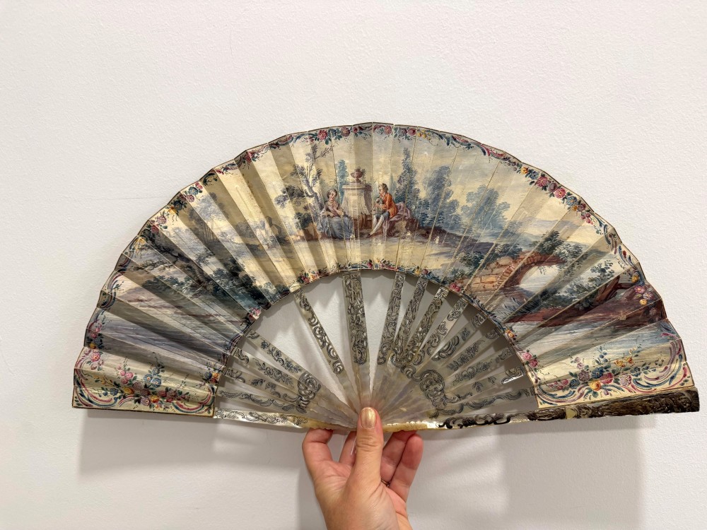 ÉVENTAIL de type plié en nacre à double demi-feuille peinte à la gouache à décor d'une scène de chasse et scènes galantes en réserves. Le revers à décor d'une scène galante figurant un joueur de musette jouant pour sa belle. Brins et panaches à décor sculpté sur fond ajouré d'une scène galante.