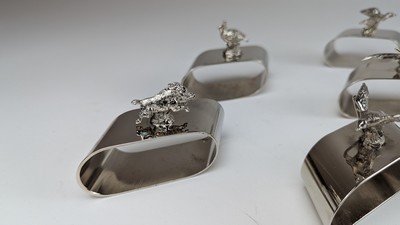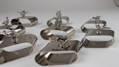DOUZE RONDS DE SERVIETTES en métal argenté à bandeau surmontés d'animaux : lapin, oie, faisan, sanglier, écureuil.