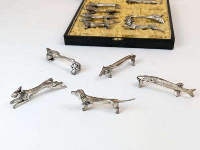 SUITE DE DOUZE PORTE-COUTEAUX en métal argenté figurant des animaux de chasse ou de pêche, à la manière de Benjamin Rabier.