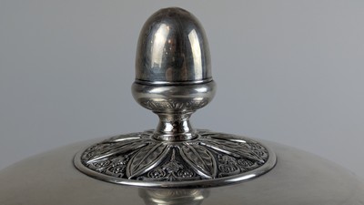 CLOCHE en métal argenté avec prise gland à décor feuillagé rayonnant.
