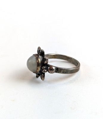 BAGUE fleur en argent (925) sertie au centre d'un cabochon de pierre opalescente blanche dans un entourage ciselé de quatre feuilles alternées de grappes stylisées.