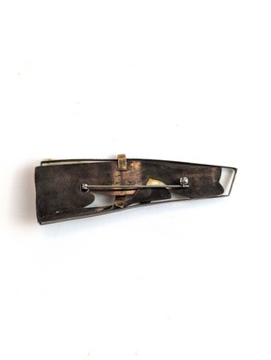 BROCHE moderniste en argent (925) et or jaune (585) ciselé et gravé sertie de deux pierres translucides rouges et bleu clair sur fond repoussé de motifs stylisés. Épingle d'attache en métal argenté.