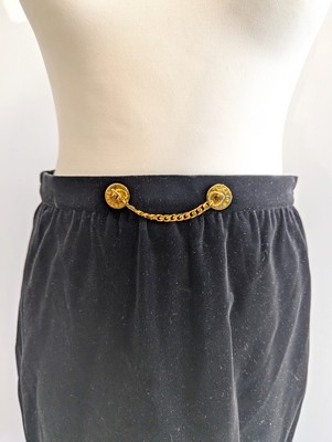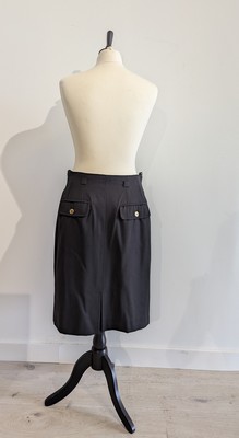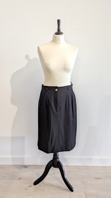 DEUX JUPES, l'une en velours noir avec deux boutons Céline doré avec chaînette, l'autre en laine noire avec deux poches à l'arrière (manque un bouton).