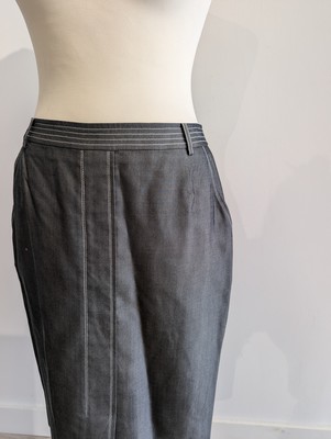 JUPE en soie gris foncé, surpiqures blanches avec pli devant, doublure en viscose.