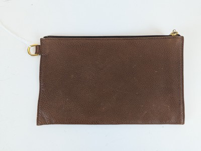 POCHETTE en cuir grainé havane à fermeture zippée. Marque estampée.