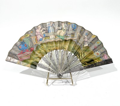 ÉVENTAIL de type plié en nacre à double demi-feuille peinte à la gouache à décor d'une scène de chasse et scènes galantes en réserves. Le revers à décor d'une scène galante figurant un joueur de musette jouant pour sa belle. Brins et panaches à décor sculpté sur fond ajouré d'une scène galante.