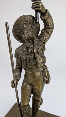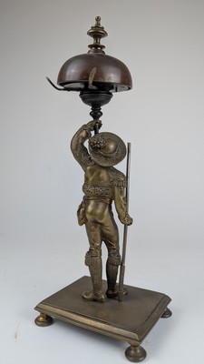[TAUROMACHIE] - SONNETTE DE TABLE en bronze, figurant un picador appuyé sur sa pique et portant le timbre dans l'autre main. Base rectangulaire sur quatre pieds.