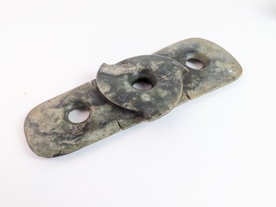 HACHE RITUELLE en serpentine à trois trous et motifs circulaires en relief.