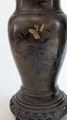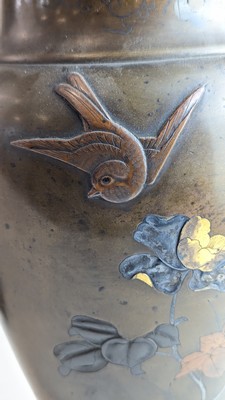 PAIRE DE VASES balustres en bronze à décor de branchages fleuris et oiseaux de différents tons, monture en bronze à la base et au col, doublure en zinc.