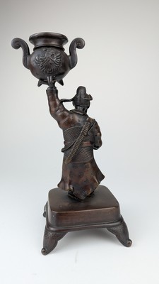 FLAMBEAU en bronze à patine brune à décor de samouraï soutenant un brûle-parfum.
