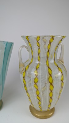 DEUX VASES en verre irisé bleu et jaune, l'un à deux anses et l'autre bleu turquoise et blanc à rayures.