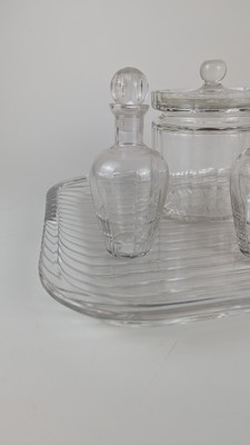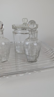 JOINT : PAIRE DE FLACONS en cristal taillé à bouchons et CONFITURIER en cristal taillé et couvercle. (Haut. 12 cm)