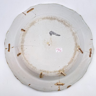 PLAT rond à bord contourné à décor polychrome au centre d'une rose jaune, vert et manganèse, et sur l'aile de trois fougères vert, jaune et manganèse.