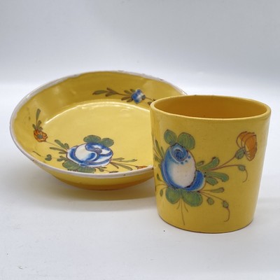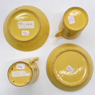 DEUX TASSES ET LEUR SOUCOUPE en faïence à décor polychrome de bouquets de fleurs sur fond jaune.