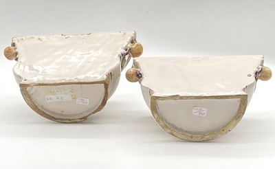 DEUX BOUQUETIERES d'applique de forme demi-lune, à deux anses en forme de poire et feuillage, en faïence à décor polychrome de bouquets de fleurs, tertres fleuris et galon sur le bord supérieur.
