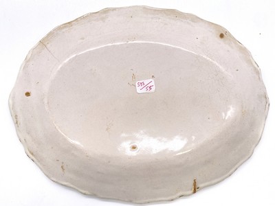 PLAT ovale à bord contourné en faïence à décor polychrome au centre d'un Chinois debout sur une terrasse fleurie et tertres fleuris sur le bord.